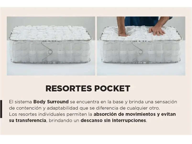 El sistema Body Surround se encuentra en la base y brinda una sensación de contención y adaptabilidad que se diferencia de cualquier otro. Los resortes individuales permiten la absorción de movimientos y evitan su transferencia, brindando un descanso sin interrupciones.