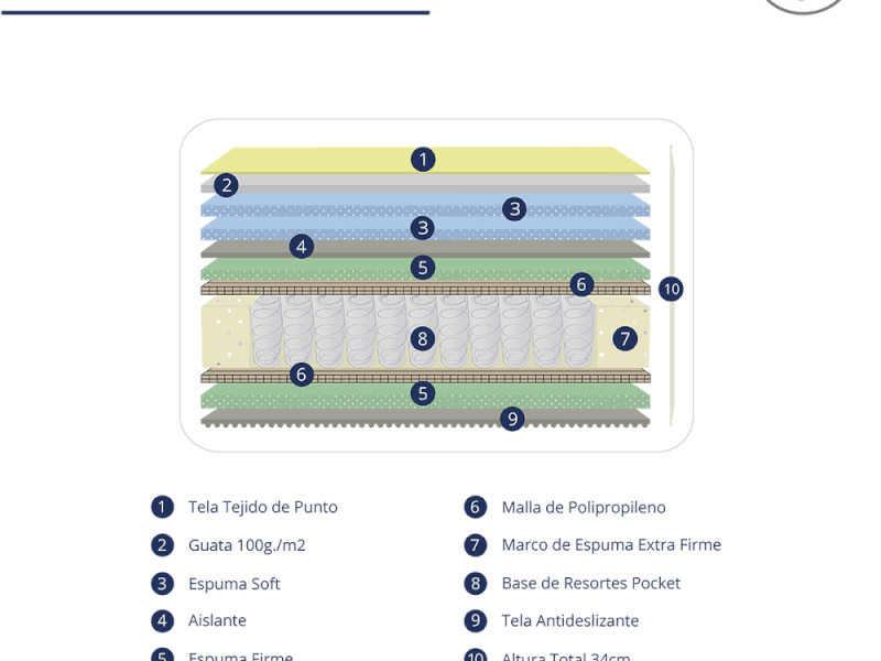Sistema de la Estructura: Resortes Pocket encapsulados en forma independiente y Marco de Espuma Perimetral Extra Firme y durable.