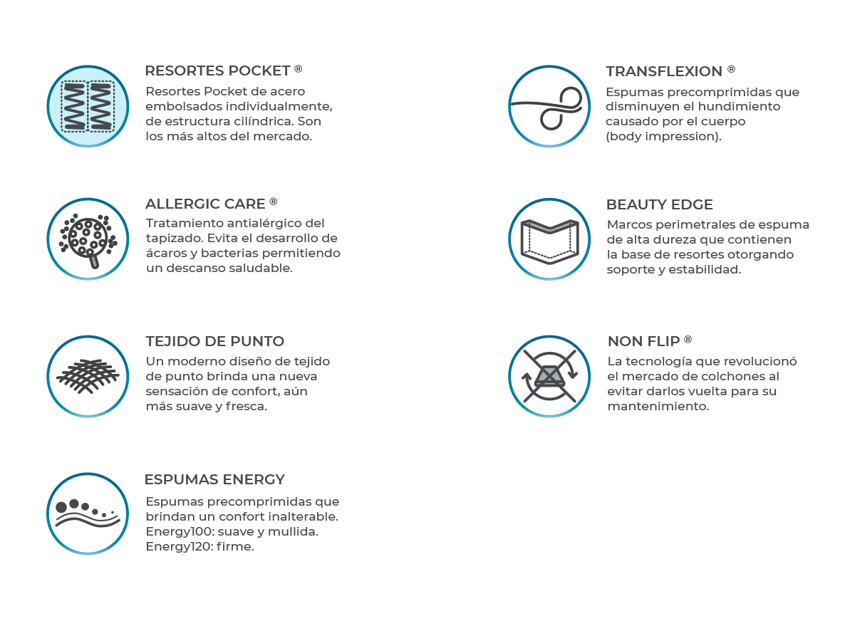 El colchón se compone de una base de Resortes Pocket Enfundados Individualmente combinados con mantas de espuma Energy y Marco Perimetral de Espuma de Alta Dureza. Europillow superior. Tapizado en Tejido de punto con Tratamiento AllergicCare. Sistema Non Flip® para no dar vuelta El modelo BeautySleep combina confort, soporte y durabilidad en un mismo colchón. Su tecnología brinda una excepcional separación de movimiento entre dos personas, asegurando un sueño profundo, reparador y sin interrupciones.