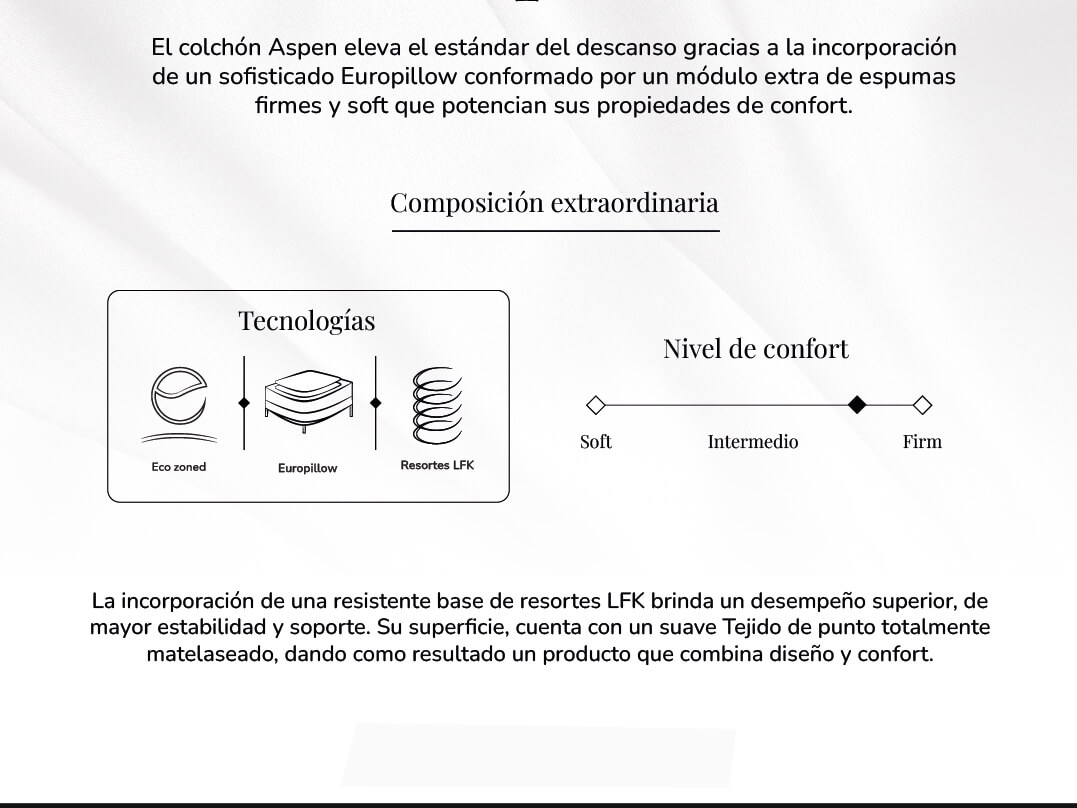 El colchón Aspen eleva el estándar del descanso gracias a la incorporación de un sofisticado Europillow conformado por un módulo extra de espumas firmes y soft que potencian sus propiedades de confort.