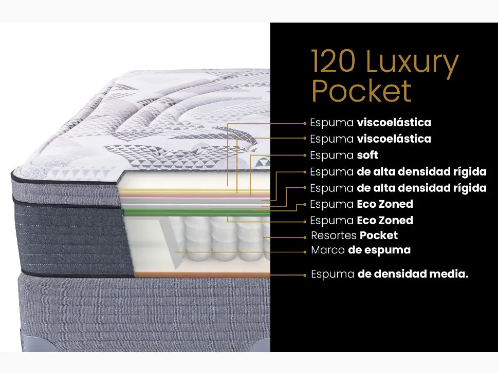 Cuenta con resortes pocket y espuma viscoelástica, disminuyendo la transferencia de movimiento al dormir de a dos y otorgando gran adaptabilidad.