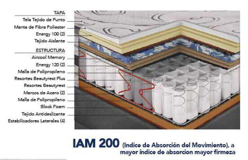 Bases con resortes enfundados de acción independiente y resortes Beautyrest Plus para reforzar la zona de los lumbares y los muslos. Todos están unidos a través del centro y pre comprimidos de 23 a 18 cm. Otorgan movimiento independiente ante la presión, menor transferencia de movimiento y aseguran un descanso sin interrupciones.